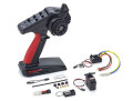 ![]() バンド管理が不要な2.4GHz帯の電波を採用した3チャンネル送信機。車が走り出さないように調整する『スロットルトリム』、車がまっすぐ走るように調整する『ステアリングトリム』、前進側とブレーキ側の動作量を調整する『スロットルエンドポイントアジャスト』、ステアリングの舵角を調整する『ステアリングD/Rアジャスター』といった無段階の調整ボリュームが装備されています。電源には単3アルカリ乾電池4本(別売)が必要です。