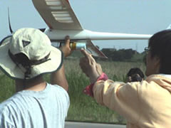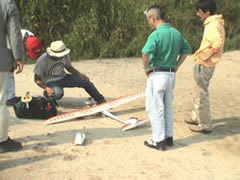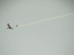グライダービデオLIFT TICKETで登場し、ゴールデンゲートブリッジを飛び回るあのF-20に装着されていたスモークライターを実験してみました。実際に使ってみると結構な量の白いスモークがでて、雰囲気バッチリです。3分くらいでなくなりますが、十分でかつ安全を考えるとこのくらいがいいと思いました。特別な装置は必要ありませんが、胴体に直接はヤハリやめた方がいいようです、「カチカチ山」になります。ポンプや特殊スモーキング装置が要らず簡単に雰囲気を楽しむことが出来て、なかなかいい感じでした。 |