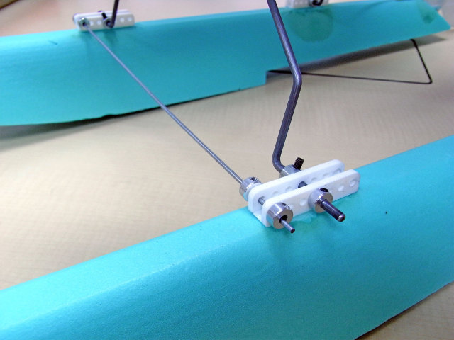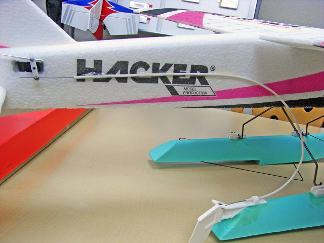 | ●発泡スチロール製超軽量フロートセットです。 基本的にMaster Stick用に設計されたものですが、機体重量800-1000g程度の機体であれば汎用的に使えます。 ●ランディングギア(ピアノ線)は、後部用の1本だけしか付属していません。フロント用は陸上用のランディングギアからタイヤを外してそのまま使用します。 製作手順: ●まず付属の型紙を胴体下に充てて後部ギアベースの埋め込み穴位置を決めます。 ●その位置のEPPを削り落とし、べニア製のランディグギアベースを埋め込み接着します。 ●ランディングギアを先ほどのベースに差し込みます。 ●フロートを2本へ移行に並べて機体ごとランディングギアをフロートの上に置きます。 ●ステップの位置がなるべく重心位置になるようフロートの最終位置を決めます。その状態でランディングギア位置を決め、フロート上面に4か所印をつけます。 ●機体を下してから、フロートをそろえて並べます。しるし位置が不ぞろいの場合は、左右どちらかに合わせてください。 ●その印位置を中心にして4個のプラスチックホルダーを埋め込みます。一度押し込んでから抜出し、今度は5分エポキシをつけて再度差し込んでください。4つのホルダーがきれいに平行になるよう注意しながら接着してください。(多少の誤差は問題ありません。) ●ラダーホルダーをまず右フロート後部に押し込み先ほどと同じように接着します。その後ラダーを差し込みボルトで固定します。あまり締めこんでしまうとラダーが動かなくなりますのでほどほどにしてスムーズに動くようにしておきます。 ●前後のランディングギアを4個のプラスチックホルダーに差し込みます。この時付属の4個のロッドストッパーもそれぞれのプラスチックホルダーの中央に差し込んで固定します。(写真ではプラスチックホルダーの左右にストッパーをつけたため、さらに4個必要となってしまいました)。この時に横から見てステップ位置が大体重心位置にあり、また胴体とほぼ水平になっていることを確認してください。 ●続いてコントロールロッドをプラスチックチューブに差し込み、まずZ型に曲げられている方をラダーホーンに差し込みます。そしてその反対側をラダーサーボホーンに接続します。 ●プラスチックチューブはなるべく動かないようにランディングギアや胴体側面に固定してください。これでラダーサーボを動かした時にラダーと同じ向きに動くか、またスムーズに動くかよく確認してください。うまくいけばこれで完成です。また念のため、フロント側だけでも左右のフロートが開いたり閉じたりしないよう、ピアノ線を通して連結してください。またこれで重心を確認し、もし前が軽い場合はフロート先端に鉛ウエイトを張ってください。 |