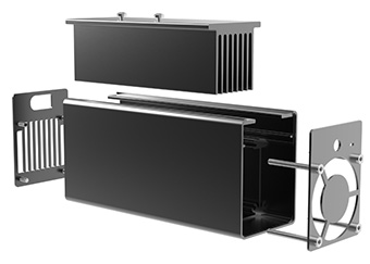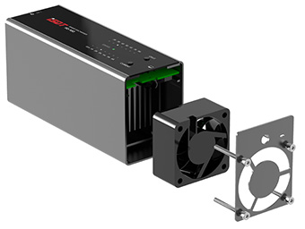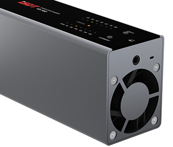 排熱エアフローも万全の設計フルメタル・ボディ。 内蔵クーリングファンの効果を最大限に発揮させるストレート・エアフロー構造。吸排気口と大型ヒートシンクのフィンを直線状に配置し、ファンによる風流を最大限に活かし、ボディ全体での排熱を行ないます。 |