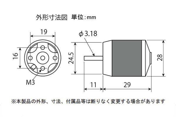 効率の良いショートタイプとなっている。![]() 規格 ・ 型式: ブラシレス14極アウターローターモーター ・ 外径: 28mm ・ 長さ: 29mm ・ 重量: 58g ・ 軸径: 3.18mm ・ KV値: 1050 ・ Wクラス: 200W 参考データ(測定データは使用機材、外気温などにより大きく変動します) ・ プロペラ: 10x6折 ・ リポバッテリー: 3セル ・ 回転数: 9300rpm ・ 電流値: 17A (交換部品) ER-221210d用シャフト(48809) |