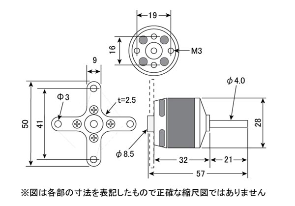 主要データ ・タイプ: 14極 カバード アウターローター型式 ブラシレスモーター ・適合電圧: 12.6~16.8V(リポ3セル~4セル相当) ・KV: 1,380rpm/V ・ワットクラス:600W ・寸法: 直径28.1mm x 長さ48.7 mm (本体のみ) ・シャフト径: 5.0 mm ・重量: 102g (参考データ) (測定条件) ・RLブランド 11x6カーボン折ペラ ・リポ3セル ・折ペラハブピン間隔34mm ・スピードコントローラー進角0度の条件で (測定値)49A ・回転数: 9,600rpm ・推力: 2,100g ※データは弊社テスト値の一例です。電流値はプロペラのサイズ、メーカー、アンプの進角、外気温、バッテリーのコンディションなどにより大幅に変動する可能性がありますので、必ずご自身で測定、使用各機器の許容範囲内である事をご確認ください。 |