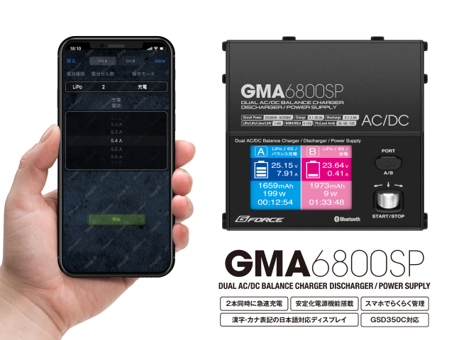 製品特徴 ●DC最大800W、AC最大200Wの高出力AC/DC充放電器 ●異なる種類/容量のバッテリーを2本同時に充放電可能 ●指先ひとつでメニューの移動、決定が可能なアルミ製ダイヤルスイッチ ●パワーサプライ機能を搭載、最大27V/15AのDC出力が可能 ●安定した動作を可能にするフルアルミ筐体&大風量ファン内蔵 ●漢字・カナ表記で直感的な操作が可能な日本語表示ディスプレイ ●PD/QC3.0の急速充電が可能なUSB Type-C出力端子を搭載 ●Bluetooth内蔵でスマホと簡単接続。専用アプリから操作が可能 ●Win/Mac対応ソフトウェアCell Analyzerから充放電の状態をグラフで管理 ●別売りのGSD350C(G0402)と連携して最大350W/40Aの大電流放電が可能 ●SCAN to GO対応QRコード付属
