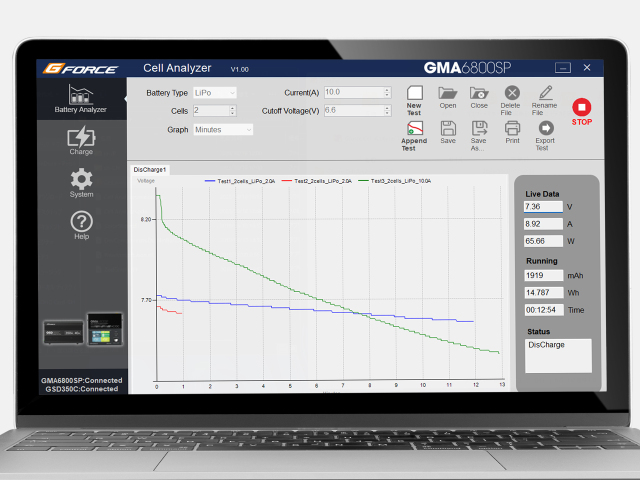 専用ソフトウェアでバッテリーの状態を可視化。 充放電管理ソフト「Cell Analyzer」を使用すると放電曲線がグラフで表示されます。バッテリーの状態を可視化する事で、よりパフォーマンスの高いバッテリーを選び出すことが可能に。 |