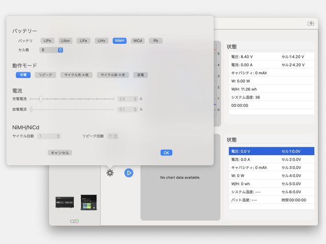 充放電管理ソフトウェア「Cell Analyzer」をWindowsまたはMac OSにインストールする事で、PC上から充電および放電の管理が行えます。 充電時間や容量、充電電流や電圧を曲線で表示するなど、さまざまなパラメータを視覚的に表示できます。 Windows版 Cell Analyzer をダウンロード MAC OS版 Cell Analyzer をダウンロード |