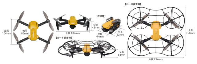 全長:104mm 全幅:134mm 全高:42mm ローター全長:45mm 総重量:80g |