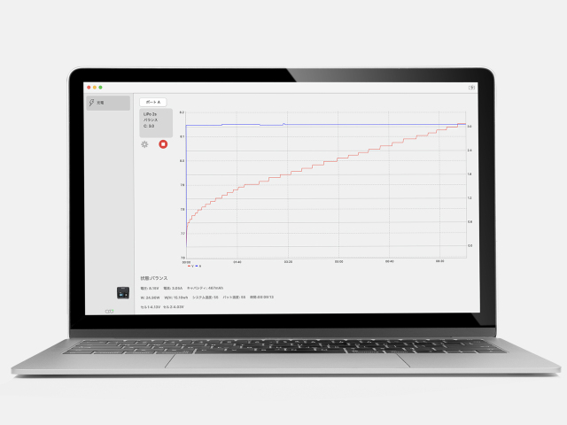 専用ソフトウェアで充放電の状態をPCで管理。 充放電の状態は、WindowsおよびMac対応の専用ソフトウェア「Cell Analyzer」を使用して、グラフで管理することができます。データを視覚的に確認でき、より精密な管理が可能です。 |